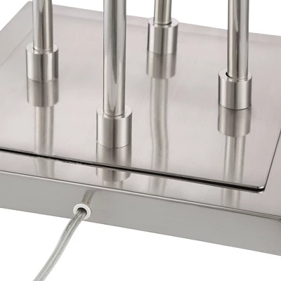 This contemporary four-light tree floor lamp with a USB dimmer comes in a sleek brushed nickel finish metal frame. Four poles of different lengths arise from a square base, giving the design a staggered height look. At the top of each pole is a double glass shade, which consists of a clear glass shade that encases an opal glass shade. The tabletop dimmer works with dimmable CFL and dimmable LED bulbs, as well as halogen and incandescent bulbs, and it also comes with a built-in USB port, allowing you to easily charge phones and other devices.